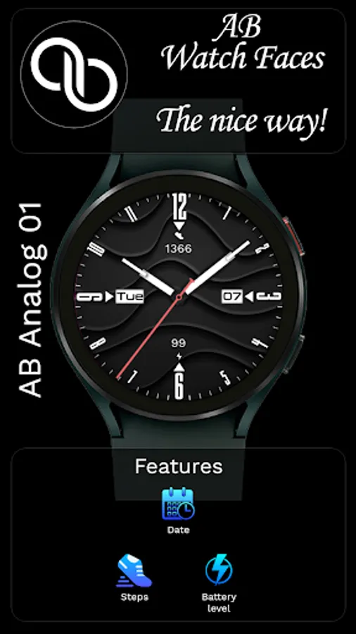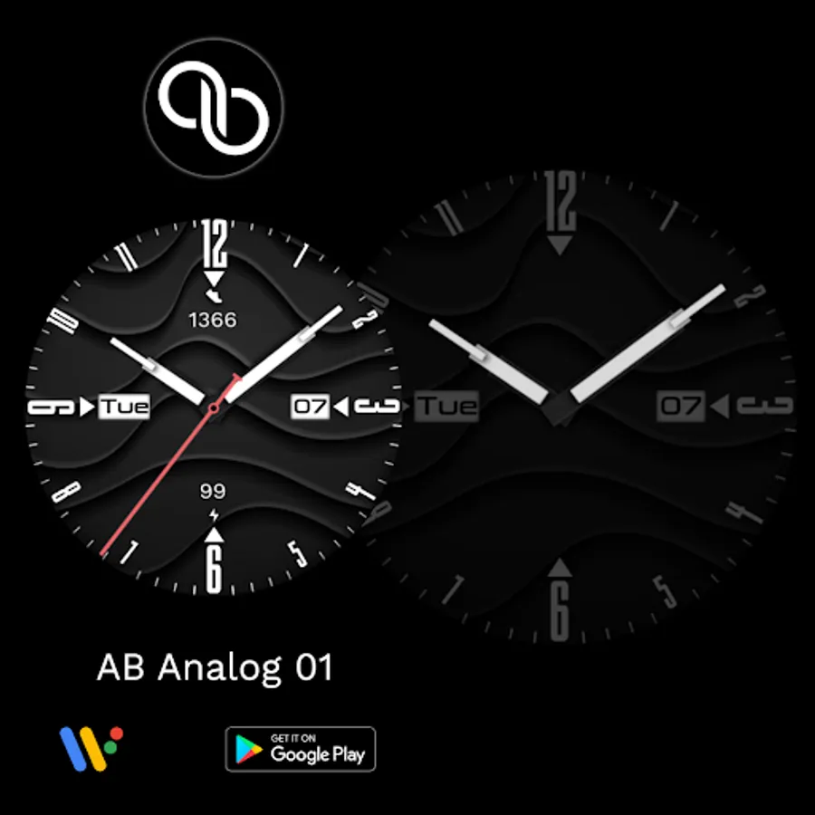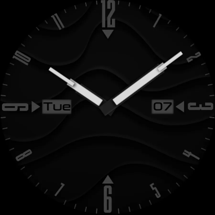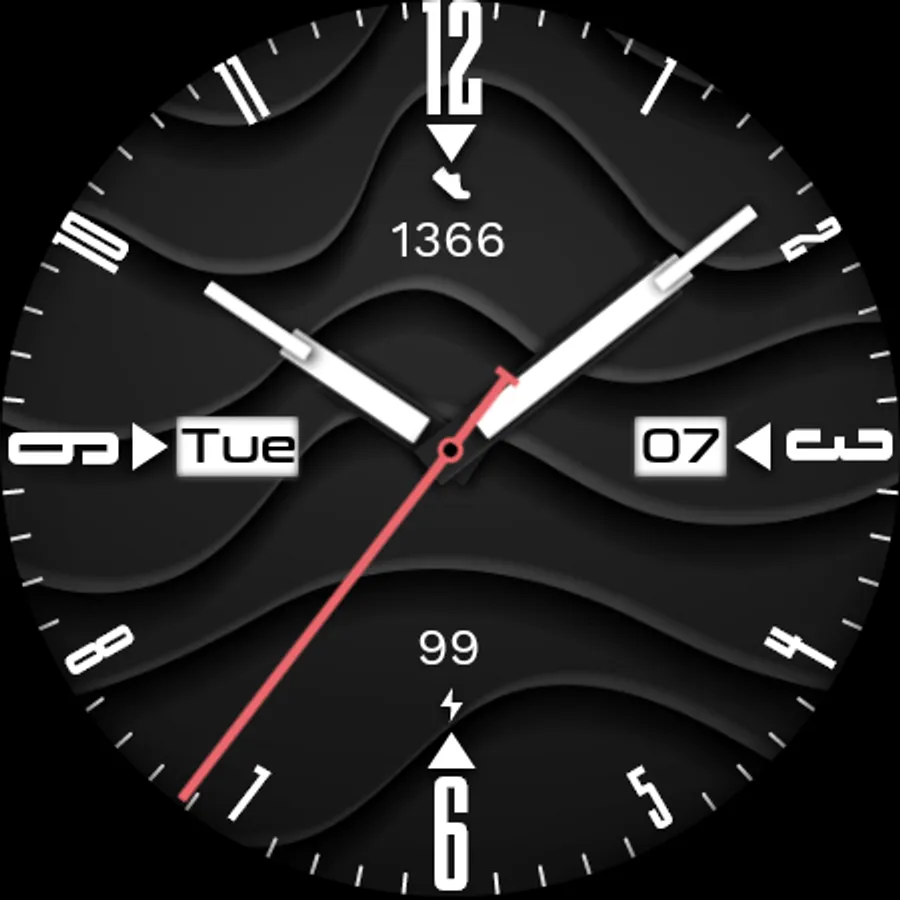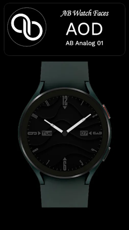 This analog watch face combines style and functionality, with a beautiful wave pattern in the background and features including the current date, steps taken, and battery level. The watch face also includes an Always-On Display (AOD) feature, which allows you to see the time and other important information without having to wake up the watch. The classic analog design gives this watch a timeless appeal, while the wave pattern adds a modern touch. Whether you're at work or at play, this watch is the perfect accessory for any occasion.