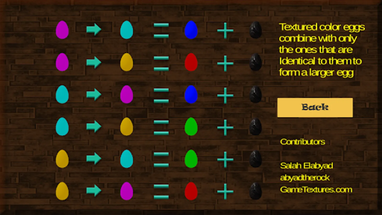 a puzzle game that will challenge your mind as you gradually combining colorful eggs by swiping your finger in the four directions and watch them and your score grow according to the following color codes:
