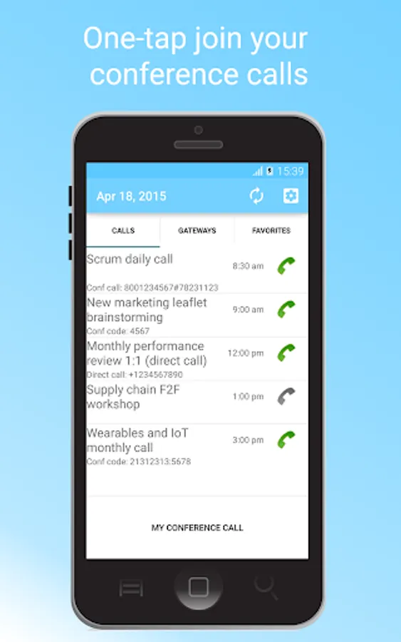 The smartest, quickest and easiest way to join conference calls (aka ATC, Audio Tele Conferencing, bridge calls or reservationless conferences in AT&T, Intercall) from your mobile device with a single touch of your screen. It’s a must have if you are working in a global environment and was already trusted by multiple top Fortune 500 companies.
