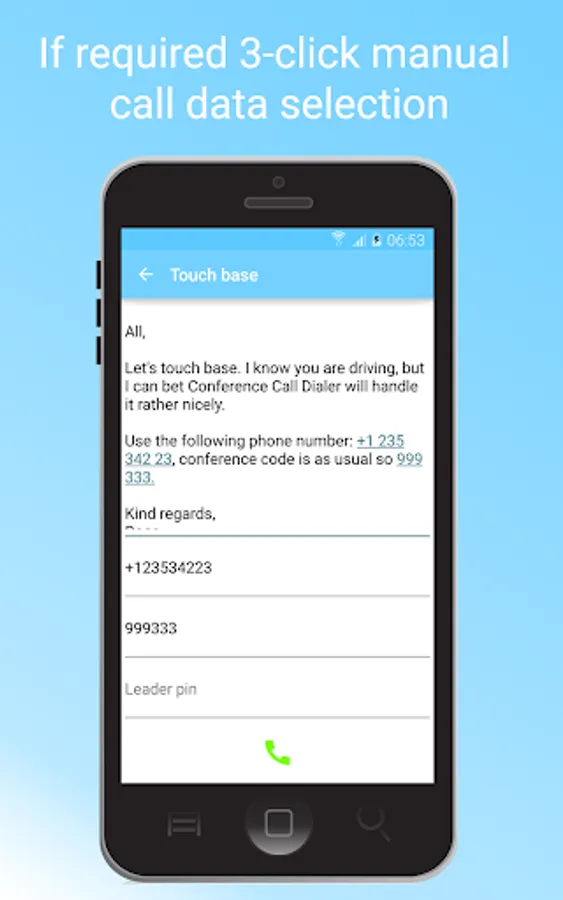 Thanks to Conference Call Dialer you will never again need to write down the participant code or search for the invitation in your mail. Everything is available right at your fingertips. No need to create any external account (like with some other apps) or synchronize your calendar into external data store, Conference Call Dialer simply works the moment you download it to your device!