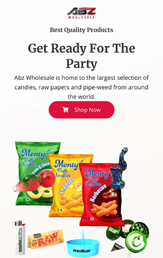 Abz Wholesale is home to the largest selection of candies, raw papers and pipe-weed from around the world.