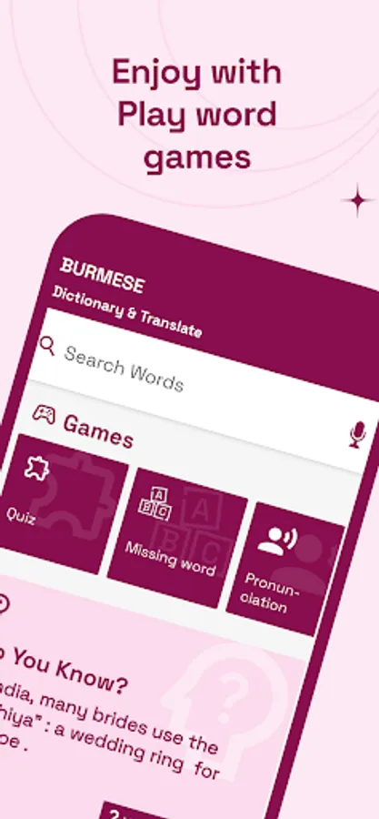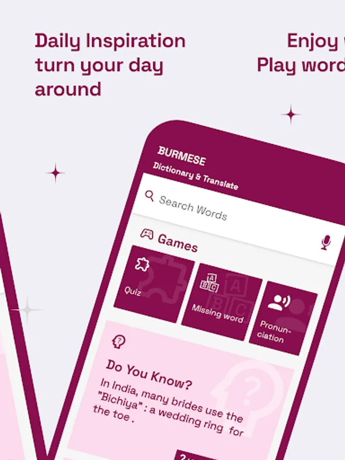 Every day you'll receive word of the day to enhance your vocabulary to improve your English means Easy to Learn English. You can learn the English language very quickly and easily from your Burmese language this utility application (Burmese Dictionary). The dictionary contains words with meaning, definition, usage example and antonyms. This Application ( English to Burmese Dictionary) Have daily Speaking common sentences to improve your spoken English too. Burmese dictionary always notifies to learn daily new words & sentences it's making some different from other students. This application ( Burmese Dictionary ) Have OCR feature which can easily identify Text from Images.