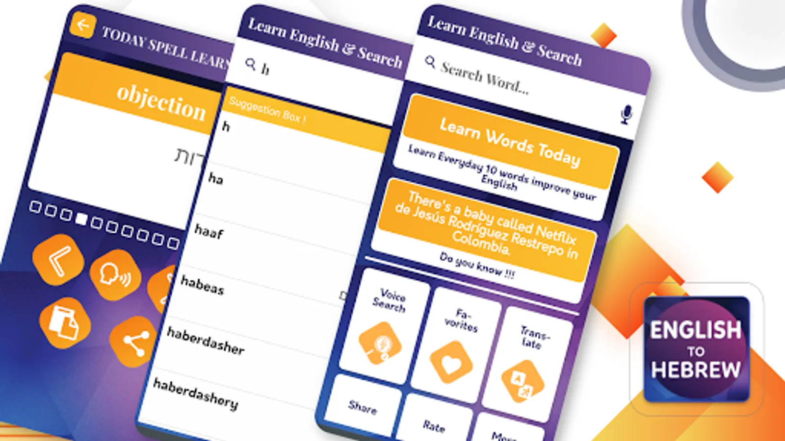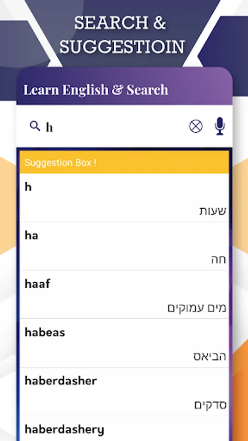 Every day you'll receive word of the day to enhance your vocabulary to improve your English means Easy to Learn English. You can learn the English language very quickly and easily from your Hebrew language this utility application (Hebrew Dictionary). The dictionary contains words with meaning, definition, usage example and antonyms. This Application ( English to Hebrew Dictionary) Have daily Speaking common sentences to improve your spoken English too. Hebrew dictionary always notifies to learn daily new words & sentences it's making some different from other students. This application ( Hebrew Dictionary ) Have OCR feature which can easily identify Text from Images.