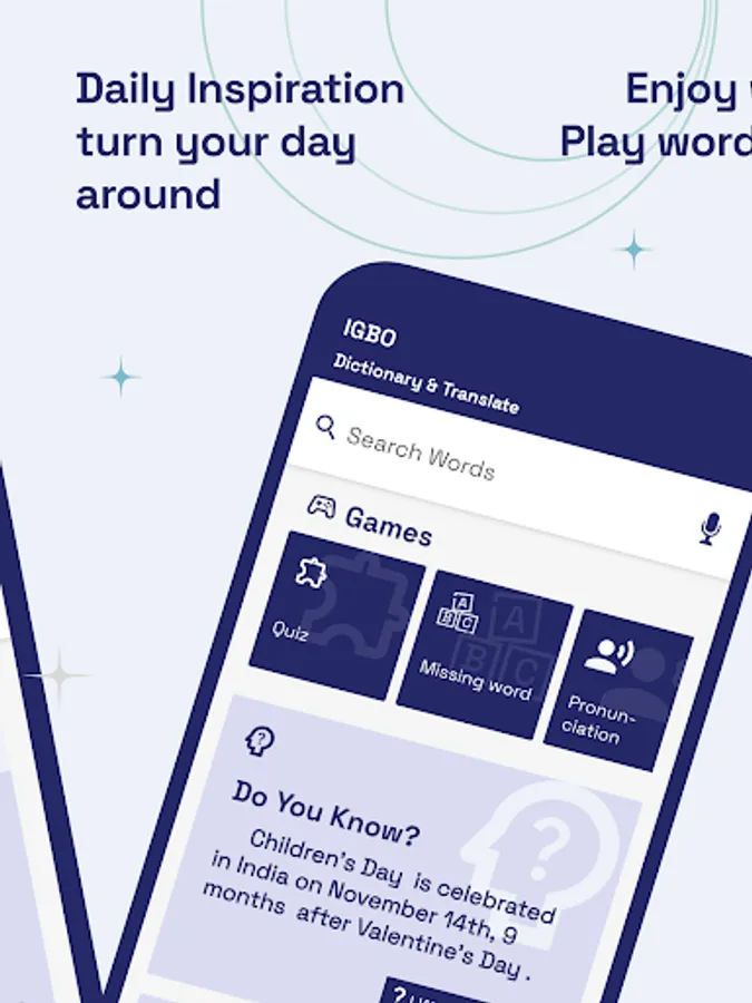 Every day you'll receive word of the day to enhance your vocabulary to improve your English means Easy to Learn English. You can learn the English language very quickly and easily from your Igbo language this utility application (Igbo Dictionary). The dictionary contains words with meaning, definition, usage example and antonyms. This Application ( English to Igbo Dictionary) Have daily Speaking common sentences to improve your spoken English too.