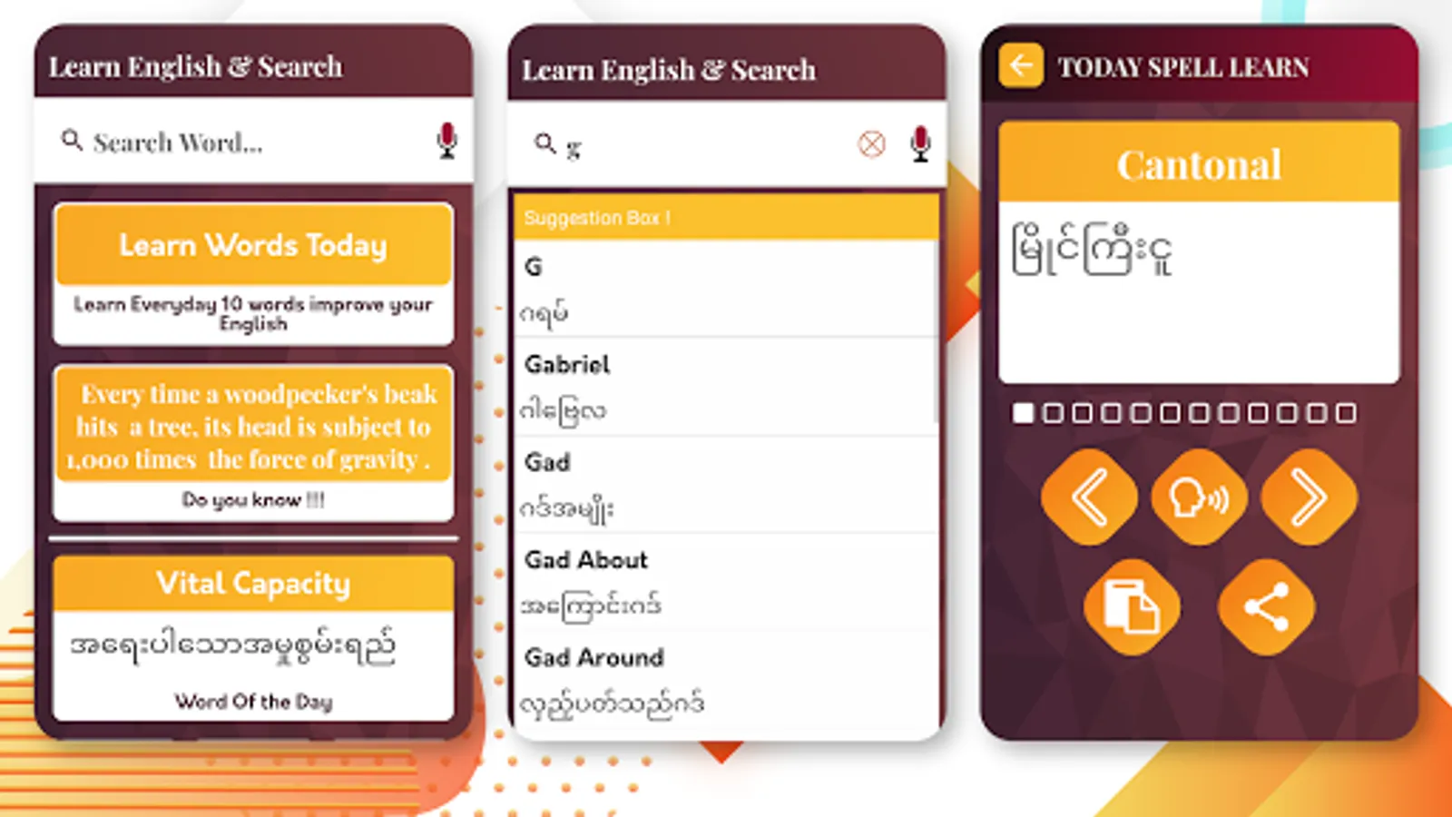 Every day you'll receive word of the day to enhance your vocabulary to improve your English means Easy to Learn English. You can learn the English language very quickly and easily from your Myanmar language this utility application (Myanmar Dictionary). The dictionary contains words with meaning, definition, usage example and antonyms. This Application ( English to Myanmar Dictionary) Have daily Speaking common sentences to improve your spoken English too. Myanmar dictionary always notifies to learn daily new words & sentences it's making some different from other students. This application ( Myanmar Dictionary ) Have OCR feature which can easily identify Text from Images.