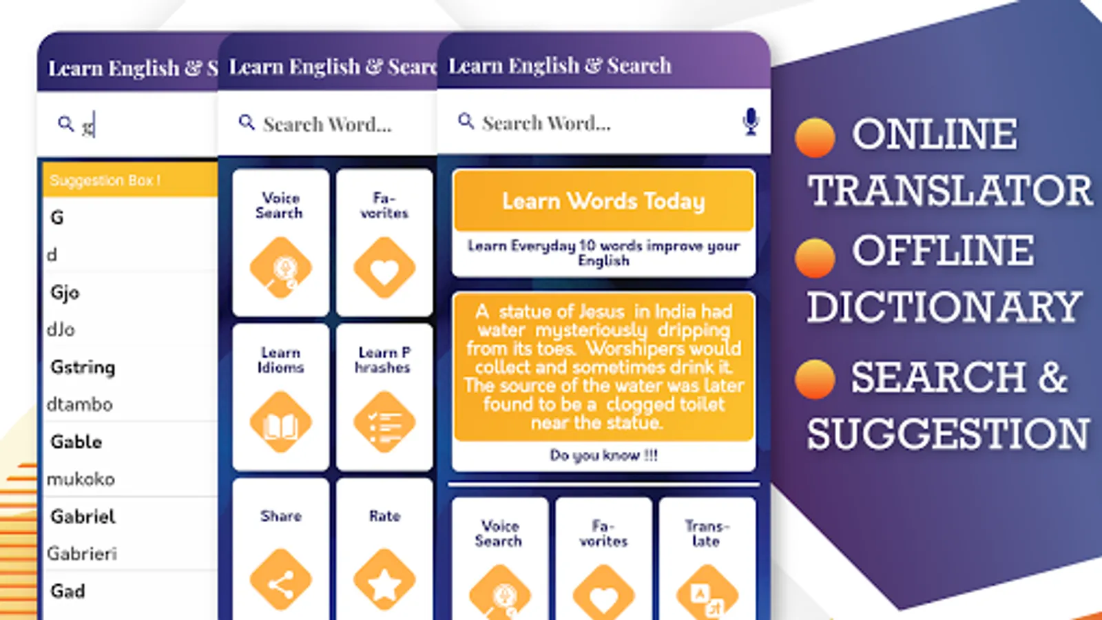 A smartly designed lightweight app works offline and gives faster results using the search box. Share words with your friends and others using this dictionary app.