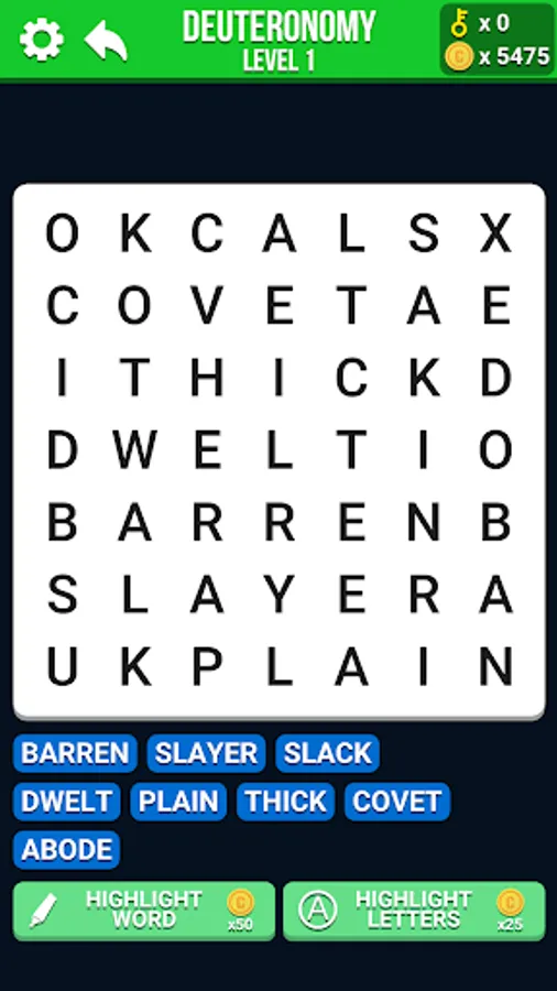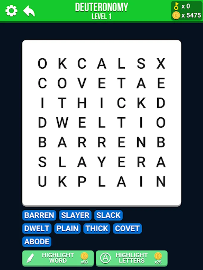 Play Casual or Progress game modes! In the casual game mode, you can generate a new random game board to play at your own leisure. In Progress mode there are a number of levels for each book of the bible you must complete in order to gain coins and keys!
