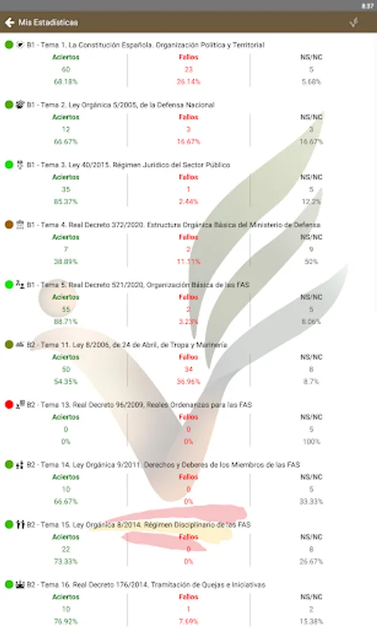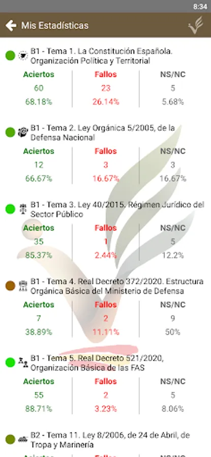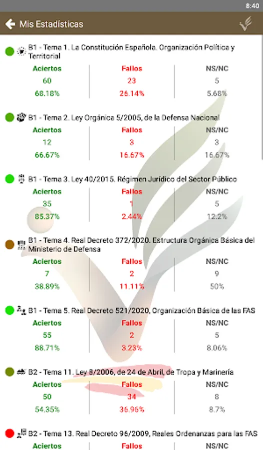 • Evaluation of learning by monitoring the results obtained by sections, indicating by means of colors which sections are better prepared, and which are worse.