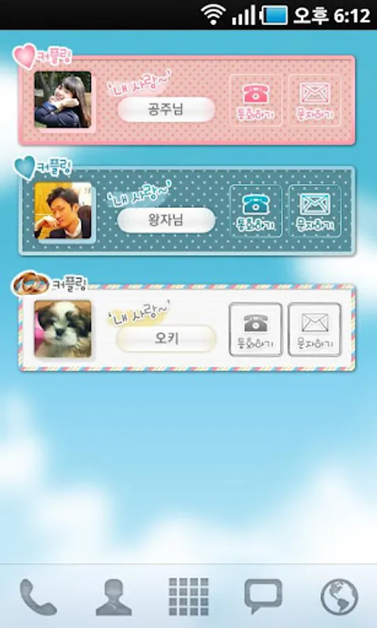-Android home widget that displays the couple's name and photo, and lets you make phone calls and send texts immediately (3 pretty themes provided)