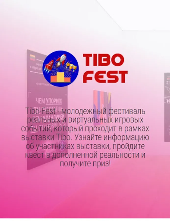 Tibo-Fest is a youth festival of real and virtual gaming events, which takes place as part of the Tibo exhibition. Find out information about the exhibitors, go through the quest in augmented reality and get a prize!