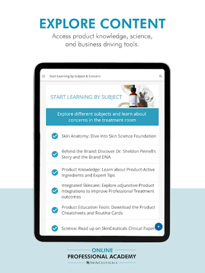 SkinCeuticals introduces our Online Professional Academy for Mobile! Learn on the go anytime & anywhere. Customized digital journeys and learning paths are available exclusively for our global partners. Content on the platform ranges from product knowledge to science, business driving tools, and professional development growth opportunities. Discover our exclusive protocols and integrated publications and connect with an engaging community of like-minded professionals.