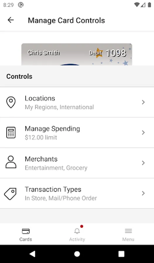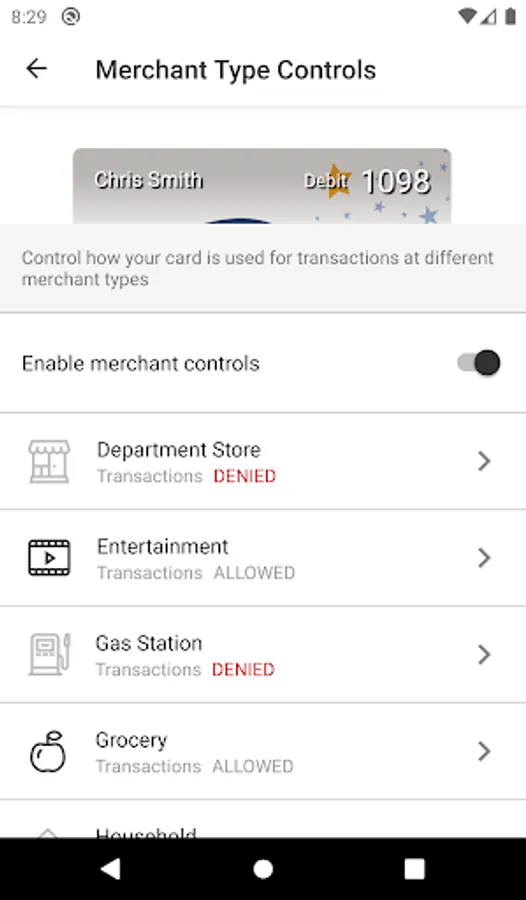 Spending limits can be established to allow transactions up to a certain dollar value and decline transactions when amounts exceed your defined thresholds. Transactions can be monitored and managed for specific merchant categories such as gas stations, department stores, restaurants entertainment, travel, and groceries. And your transactions can also be monitored for specific transaction types: in-store purchases, e-commerce transactions, mail/phone orders and ATM transactions.