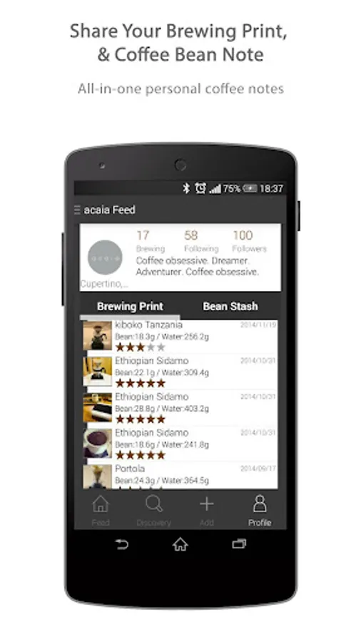 The Acaia coffee app provide a smart and easy way to record your coffee lifestyle, you can create a Acaia coffee brewing print, take a shot of your cup of joe or create a coffee bean note to share it with everyone. The Acaia coffee scale connects to the app, collects the essential coffee brewing data such as coffee bean and water weight, calculate the ratio and allows you to log the coffee brewing data in the app.