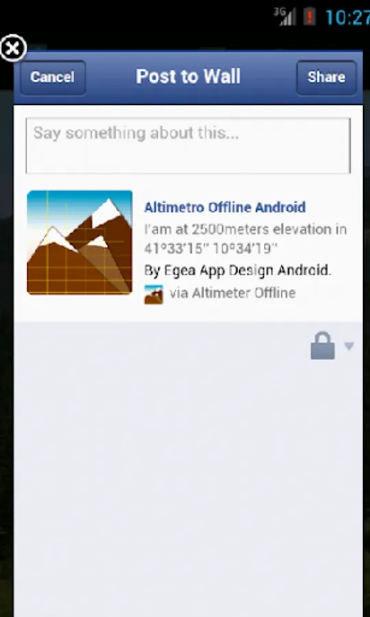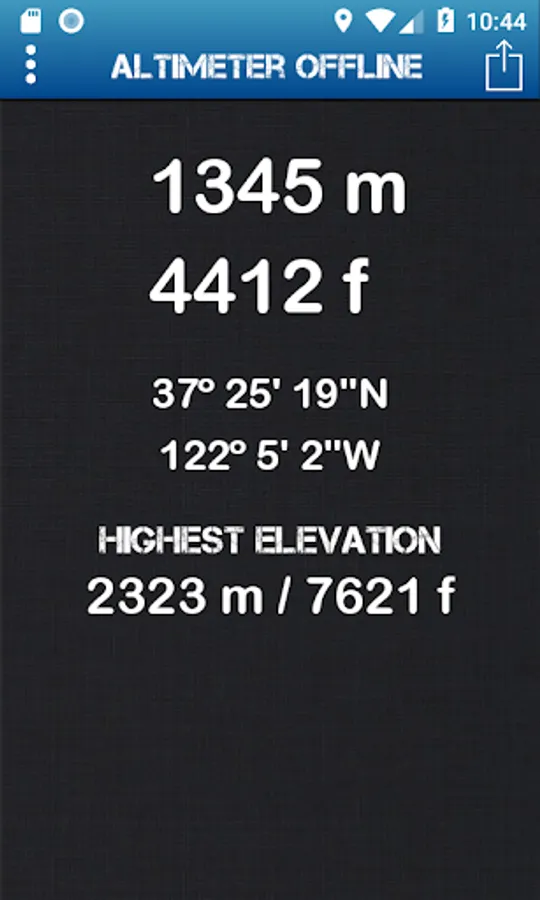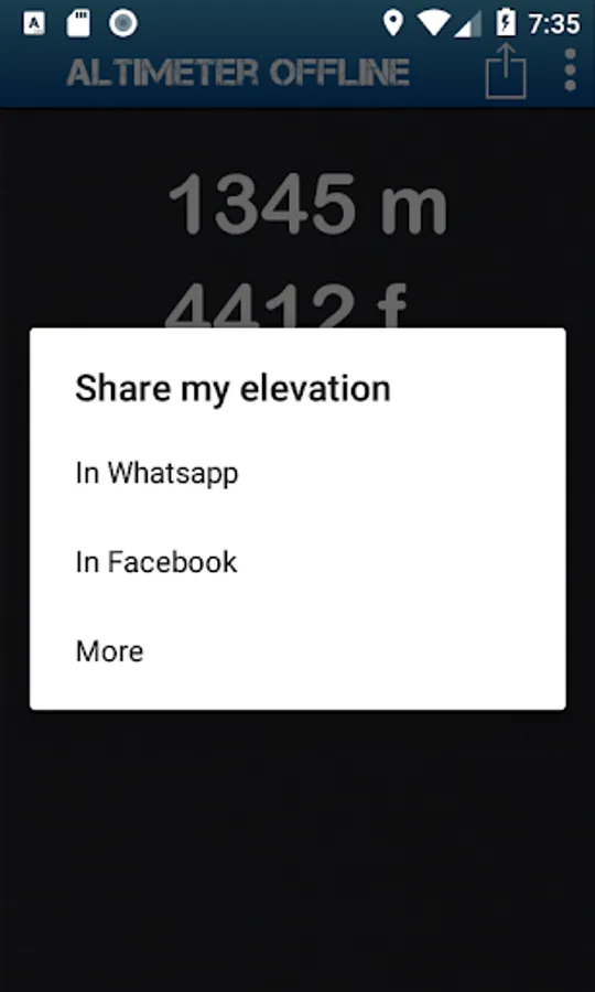 Share with your friends on Facebook and WhatsApp, your current elevation and coordinates with this offline altitude app!