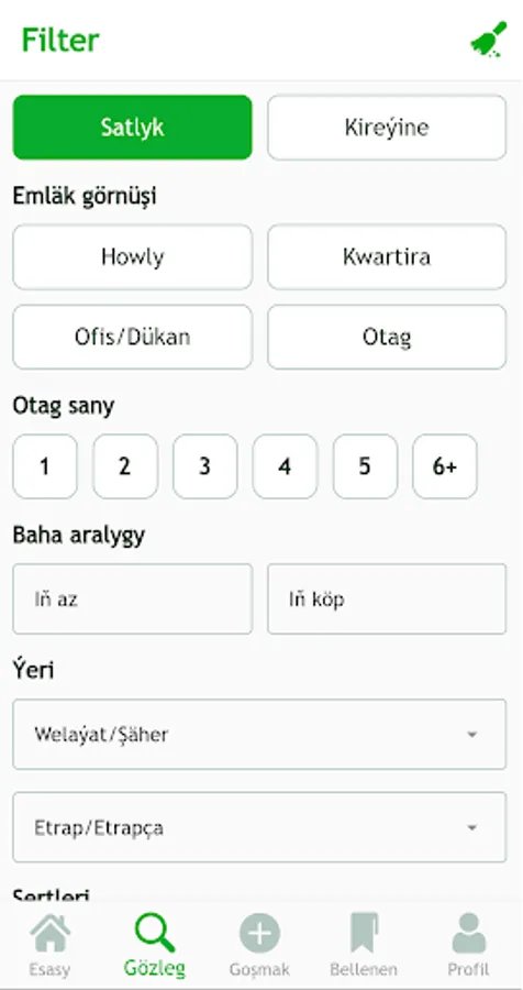Islegiňize görä howly, kwartira, ofis, dükan, otag we beýleki gozgalmaýan emläkleriň mahabatlaryny bir ýerde görmek, satyn almak ýa-da satmak mümkinçiligine eýe bolan Açiasyızi prı prı prı