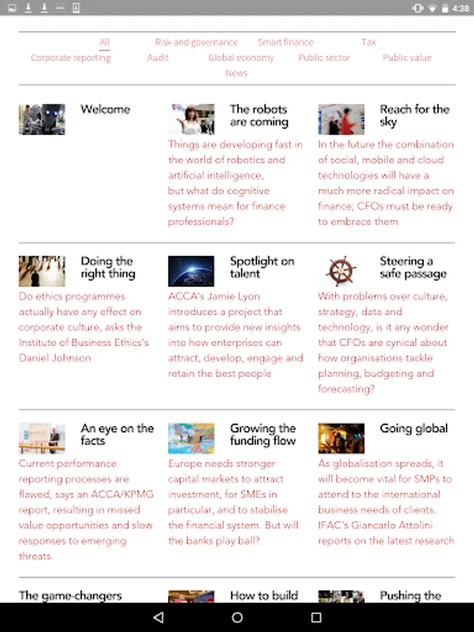 ACCA’s Professional Insights app gives you access to research, reports and our latest thinking on issues crucial for business, economies, society and the accountancy profession - now and in the future.