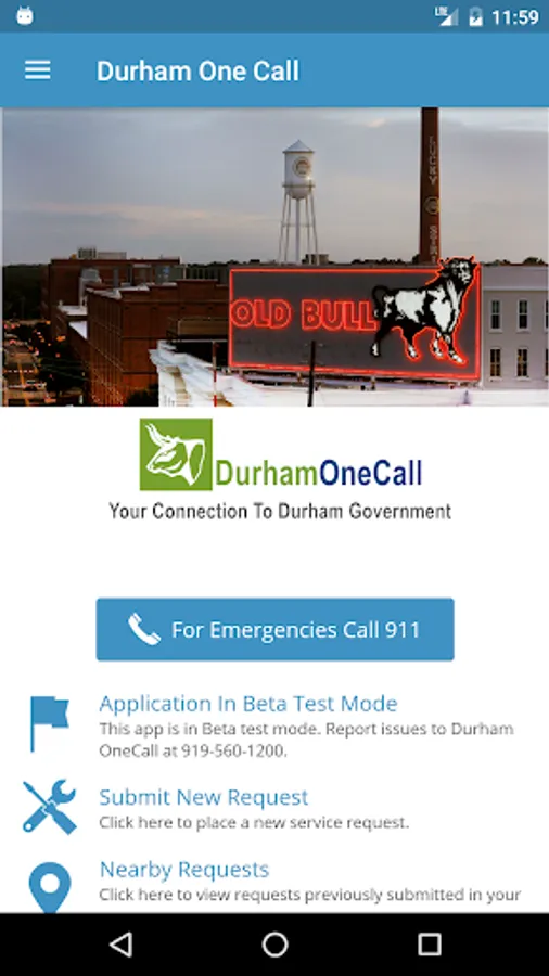 Service in the City or County of Durham, North Carolina, is now just a touch away with the introduction of the Durham One Call smart phone app. With just one touch, you can now find the latest information and services offered by the City and County. Learn about or request services such as waste collection, recycling, potholes, street repairs, litter, unsightly properties, water and stormwater services. Use this smartphone app or call 919-560-1200 to launch a service request that will connect you with the appropriate department.
