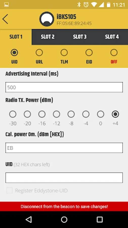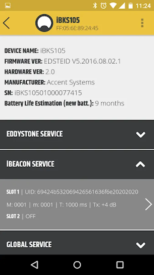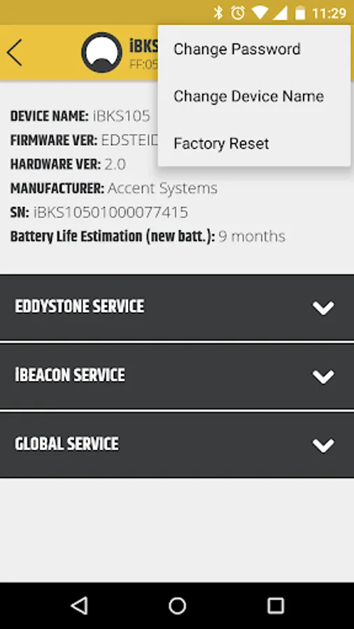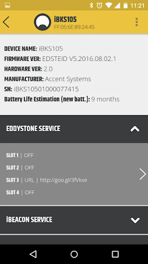 - Connect to iBKS beacon devices in connectable mode, view and modify the following characteristics: iBeacon slots, Eddystone slots, device name, password, connectable modes and factory reset.