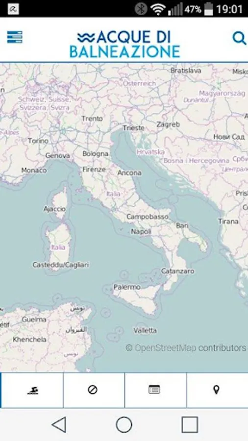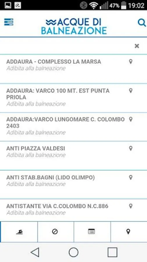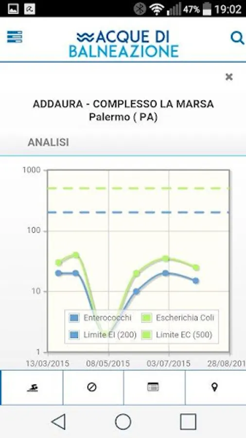 The user can check the bathing area, any bathing prohibitions, the analytical results of the monitoring, the environmental information, any criticalities