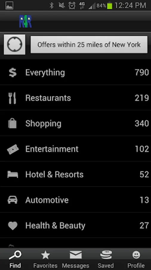 The Instant Rewards program provides for a number of Search Options to help you to define which coupons will be presented to you. One option allows you to set your current GPS location so the coupons at the top of the list are the ones closest to your present position. Another entry allows you to define a fixed radius around your current location, then, when you can enter a zip code, or a location, and tap on a Reward Category such as Dining, the system presents you with a list Instant Dining coupons within a fixed distance of your current location.