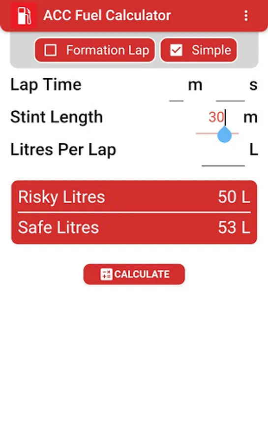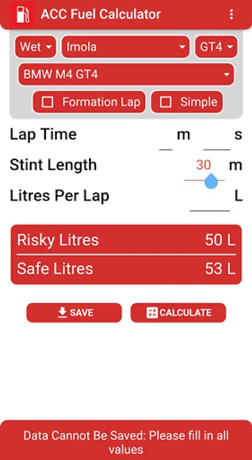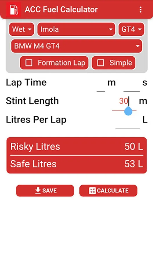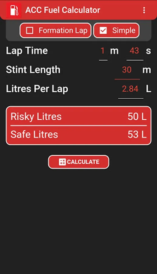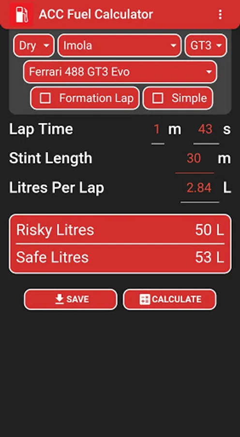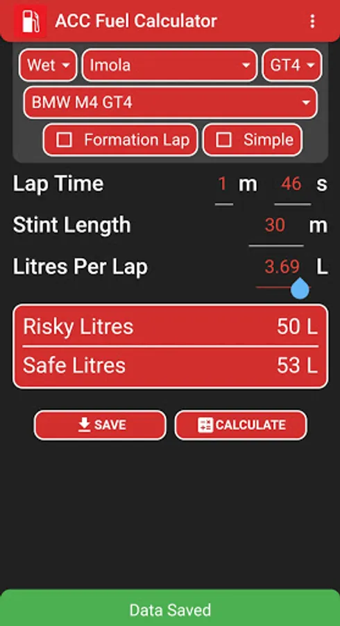 Using your lap time, race length and litres of fuel used per lap, the amount of fuel needed for that race can be calculated and presented to you immediately, as well as providing an extra safe value for fuel to ensure that you do not fall short of the finish line.