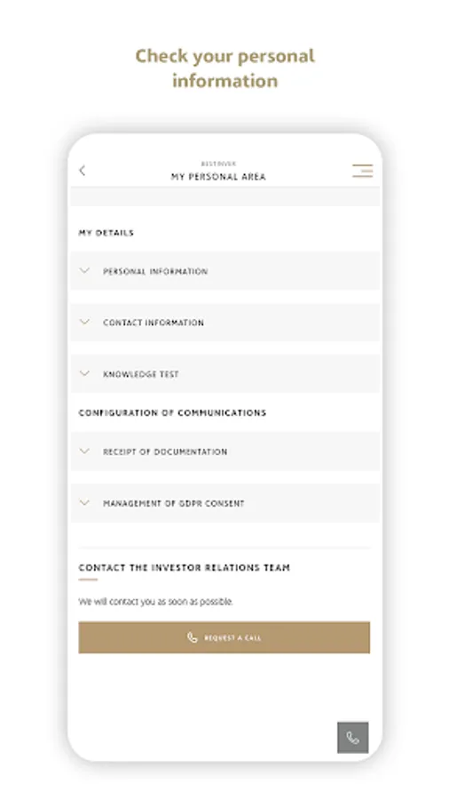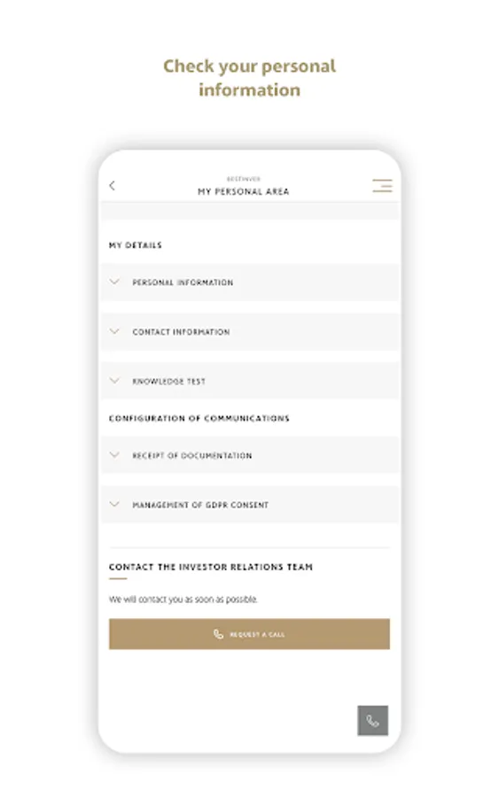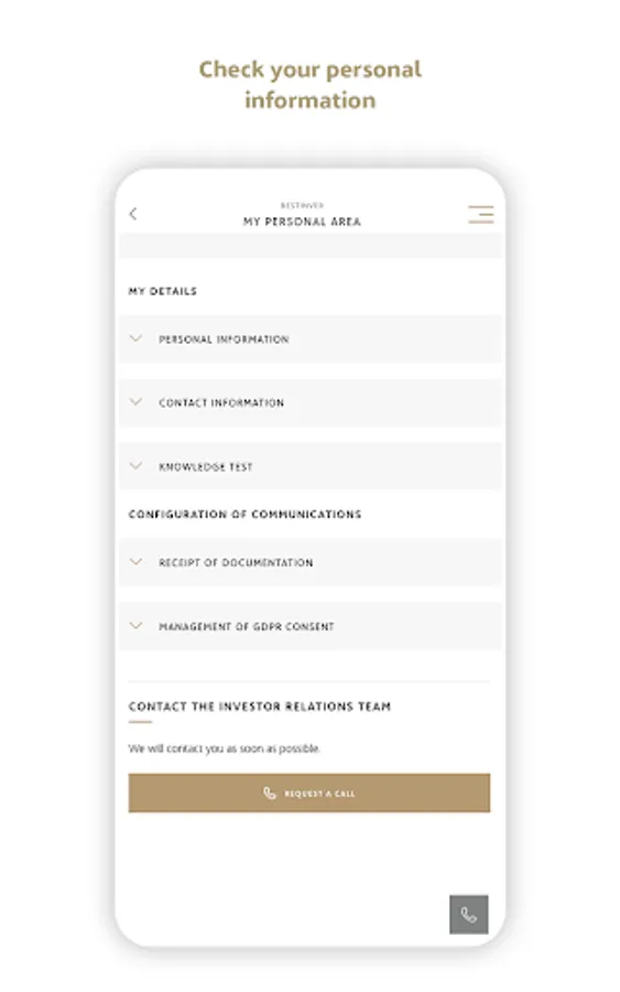 In this area, you will find your personal data. Here you can change your password, email address and contact address (which you must confirm by signing the PIN received on your mobile phone), update your knowledge test, configure your communication preferences and manage the transfer of consents.