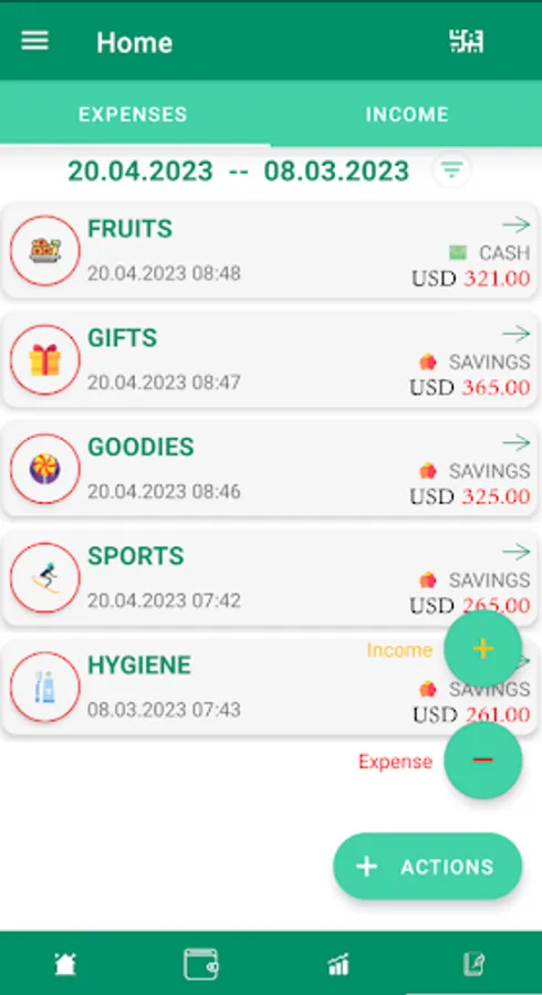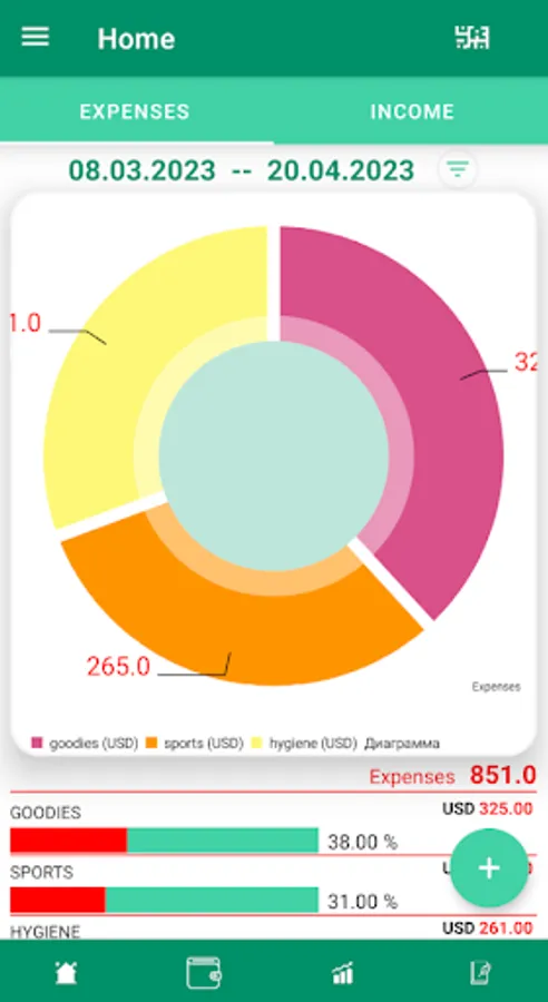 Приложение позволяет вести учет расходов и доходов, делать отчет по расходам и доходам, и наглядно увидеть историю расходов и доходов.