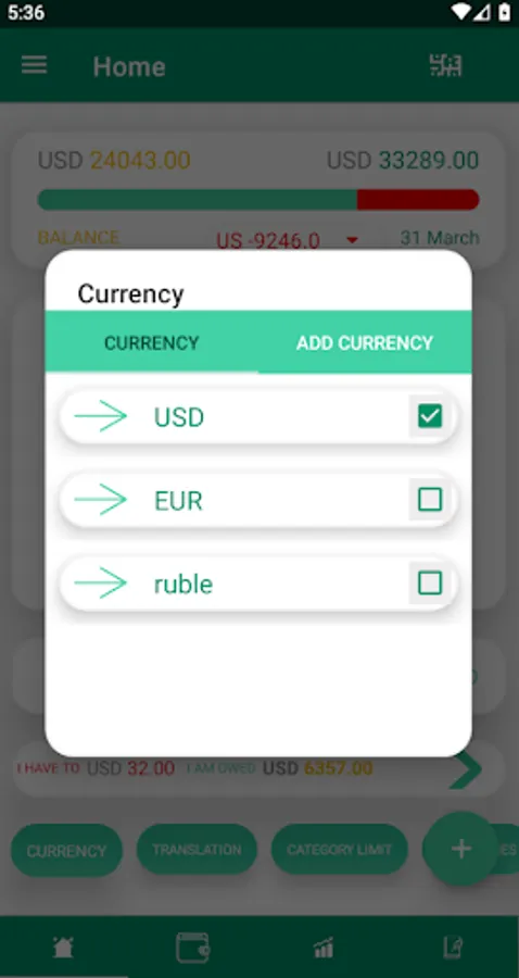 При добавлении расхода, когда выбирается категория из всего списка категорий для расходов, также когда выбирается счета или валюта, там можно соответственно создать категорию, счет или валюту. Аналогично с доходом.