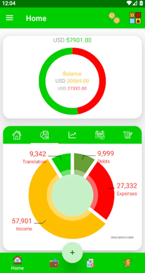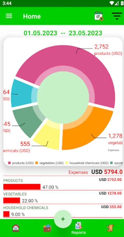 Reports. Reports can be made for expenses and income. Reports are generated in the form of a visual diagram.