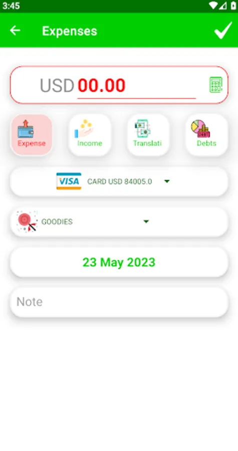 Adding an expense or income is to enter an amount, select a product category (expenses), select an invoice, and also select the type of expense (expense, income, debt or transfer).
