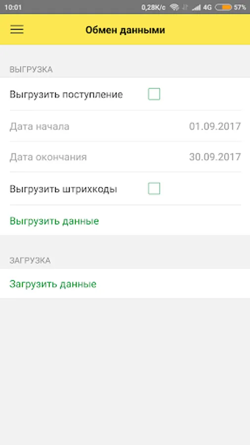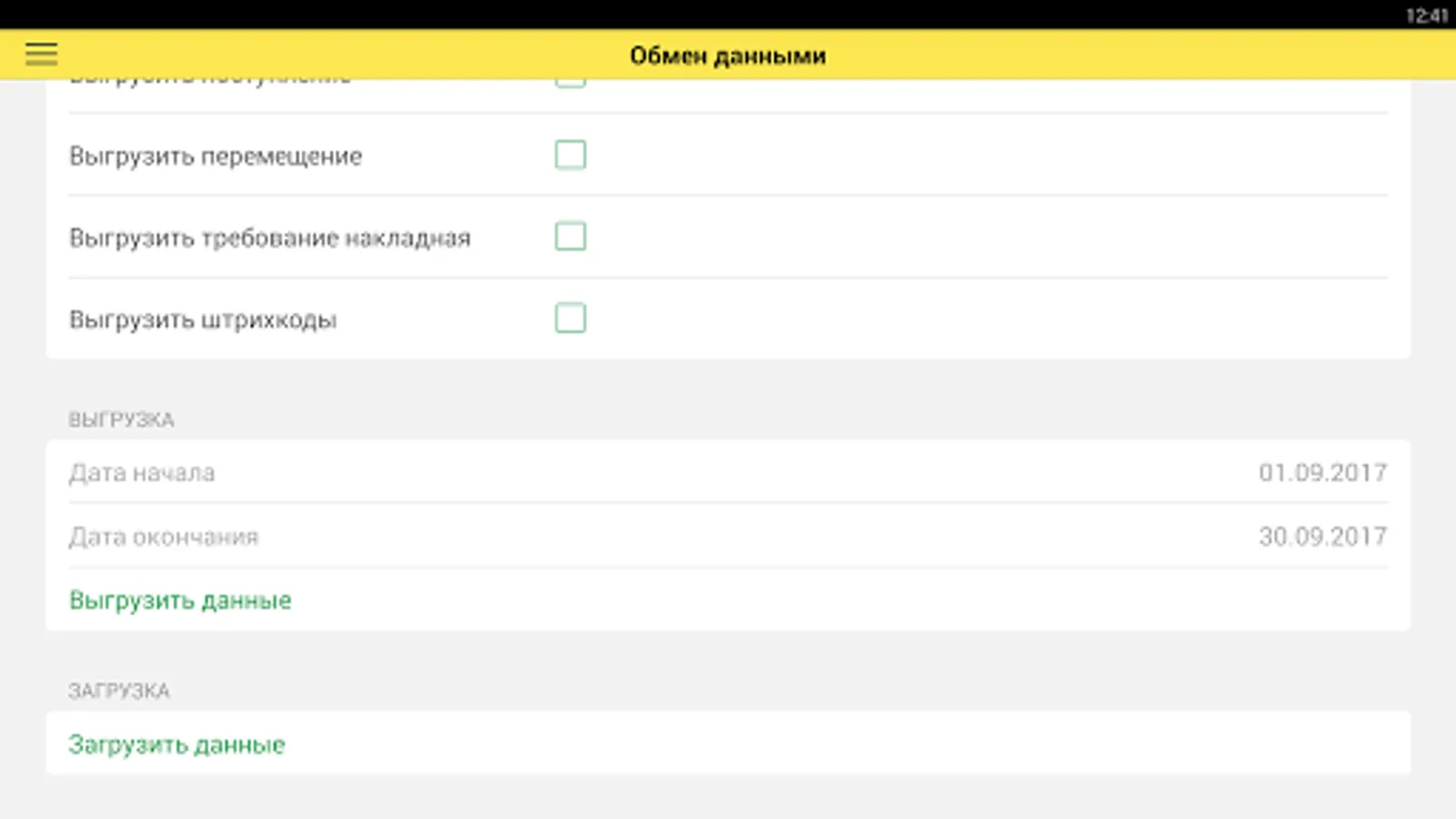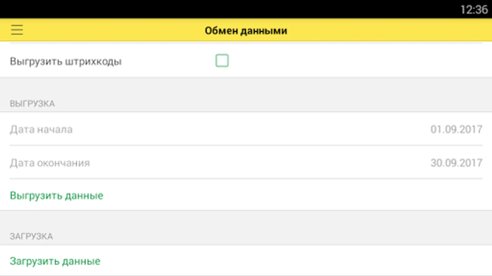 Data are exchanged by saving / loading the file with the necessary data in a directory selected by the user. For this is the treatment of "Communication". To unload it, you can specify: upload documents of receipt and / or barcodes or not, as well as during unloading documents.
