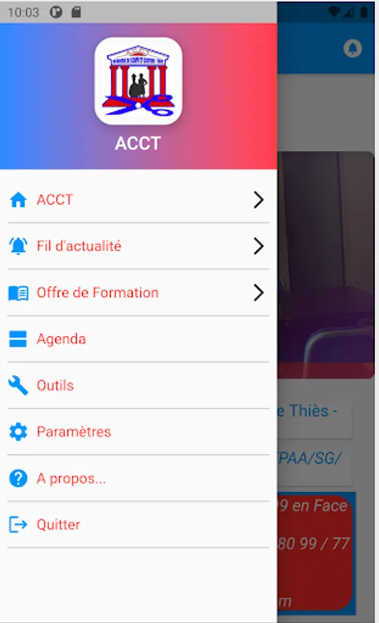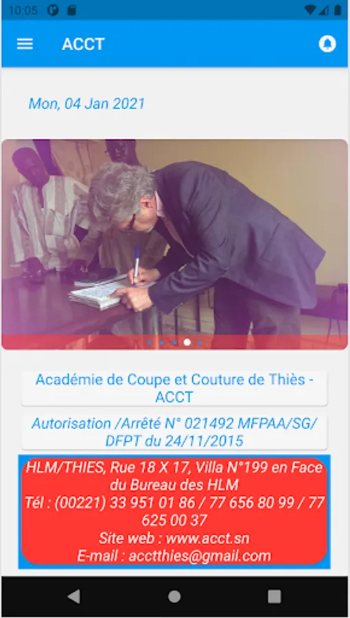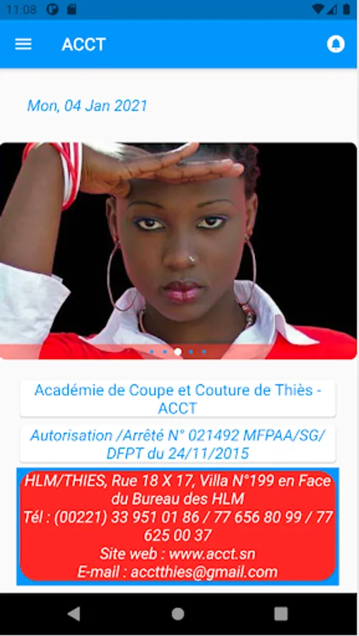 ACCT (Academy of Cutting and Sewing - THIES is the mobile version of the cutting and sewing school based in Thiès, Senegal. The application allows the public to collect information to integrate the school and also to students already enrolled to have news about the establishment, to follow their schedule and to have tools that will allow them to study more easily.