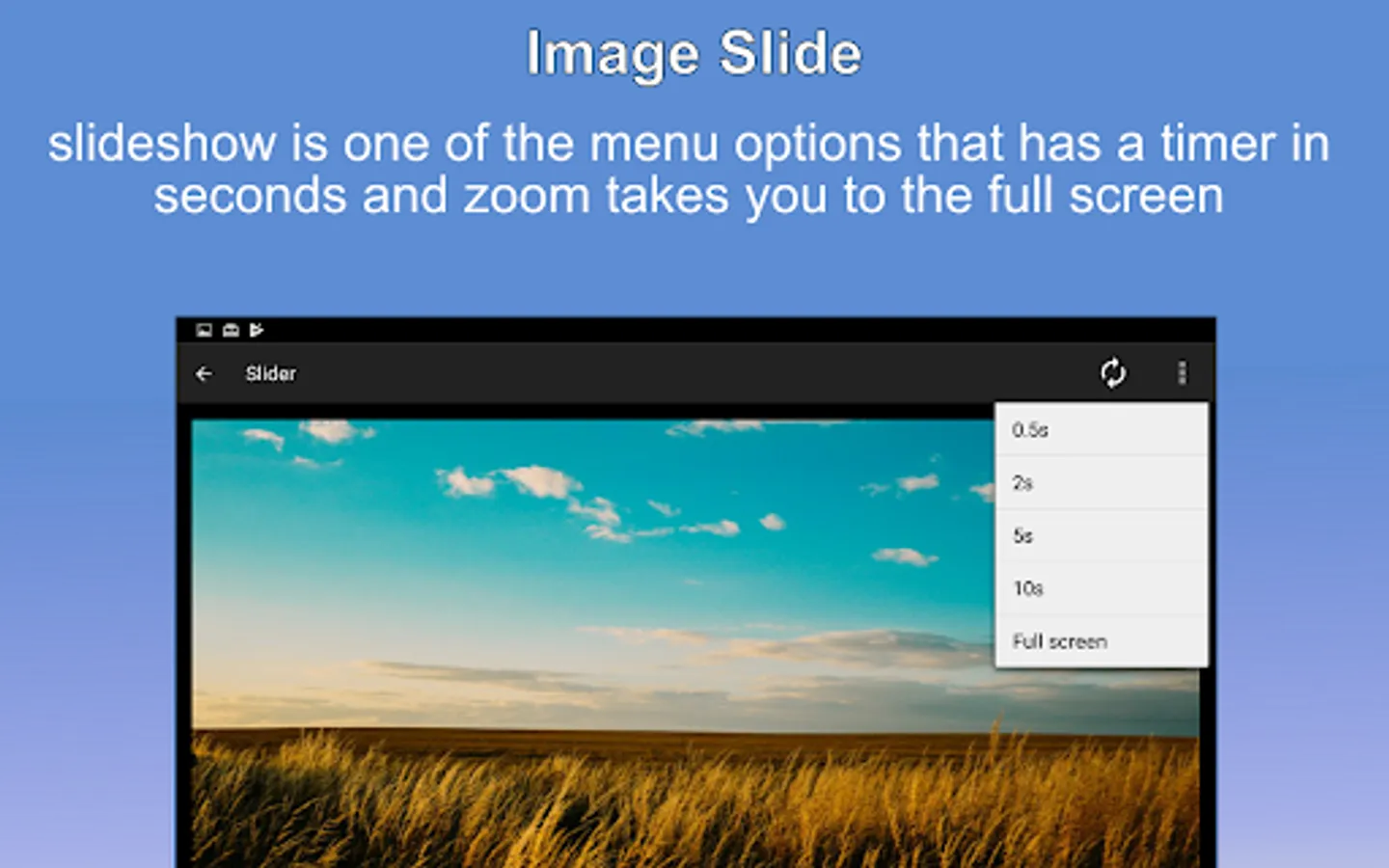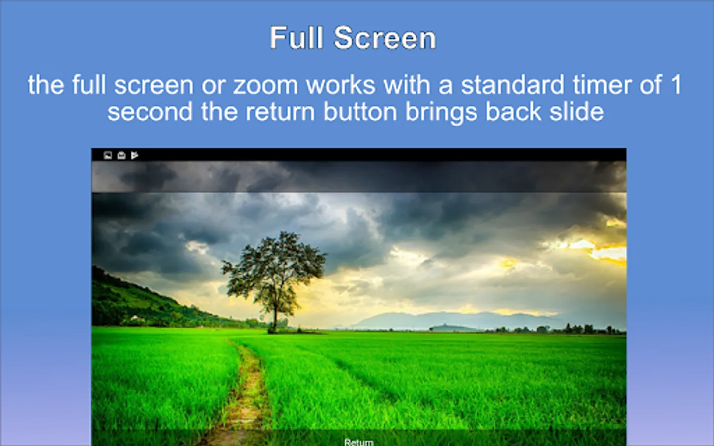 Another utility provided in the display of the images in a Slide Show timing options of 0.5, 2, 5 and 10 seconds and the full-screen display via the Zoom menu option.