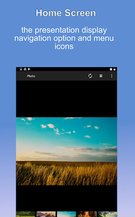 The Photoenlance application is useful for displaying images in Bitmap, GIF, JPEG and PNG formats on your home screen after you select a folder containing images or photos through the icon on the menu bar using a file explorer. Images can be selected using the thumbnails at the bottom of your Android Tablet screen.