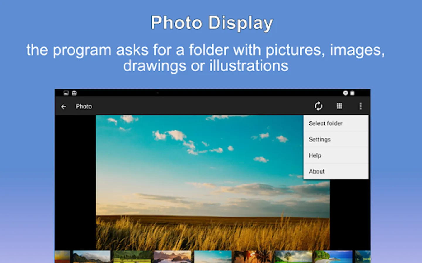 This version also includes a menu with Select Folder, Settings, Help and About the Settings item provides in one of its alternatives the registration of the last directory or folder accessed by initializing it in the next use of the program and another one that configures the way of displaying the photographs on the home screen.