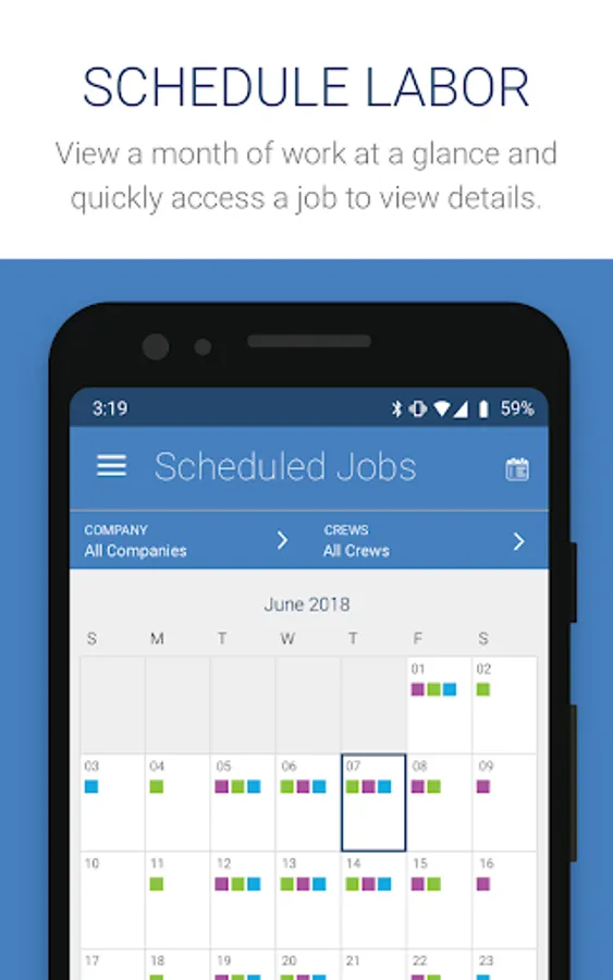 The calendar view shows a quick snapshot of work scheduled for your crew(s). The list view displays the most important details of the jobs scheduled to your crew(s) such as the job number/name, the scheduled start time, the job site address, and crew assigned all at a quick glance. These views also allow you to filter the data to narrow down the results shown.