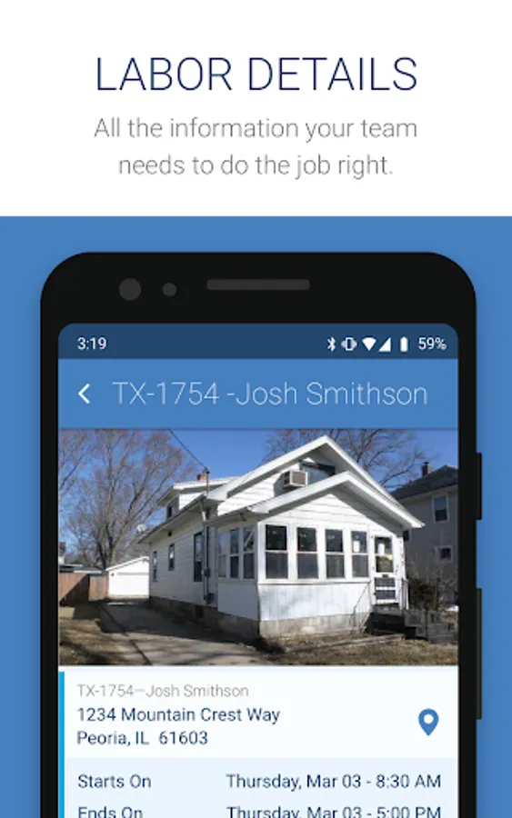 Labor Orders in AccuLynx are shared to the app and displayed in a user-friendly view, providing access to important information including the job site address, scheduled start date/times, labor order details, instructions, and checklists.