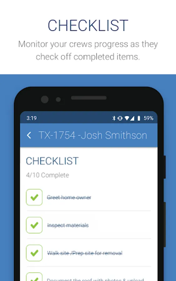 Assigned Checklists can be completed in the app as progress is made at the jobsite, giving managers a real time update and ensuring all tasks are accounted for without actually having to be at the jobsite