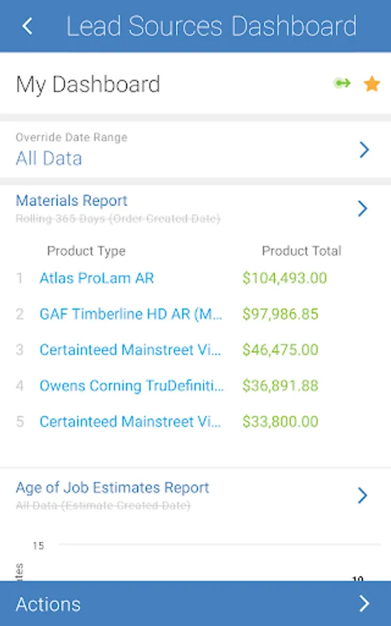 The ReportsPlus mobile app gives you a convenient view into all of your available reports. Choose from pre-built reports that offer insight on job milestones, supplements, permits, materials, accounts receivable, estimates, dead leads, and more. Your favorite reports are sorted to the top of the list for quick and easy access to the data you use most.Review and Customize Dashboards