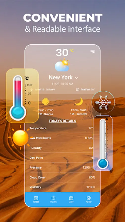 This climate forecast app is a convenient tool that gives you fast, accurate and complete forecast info. Real time temperature, humidity, pressure, wind force and wind direction are all in this weather app based.