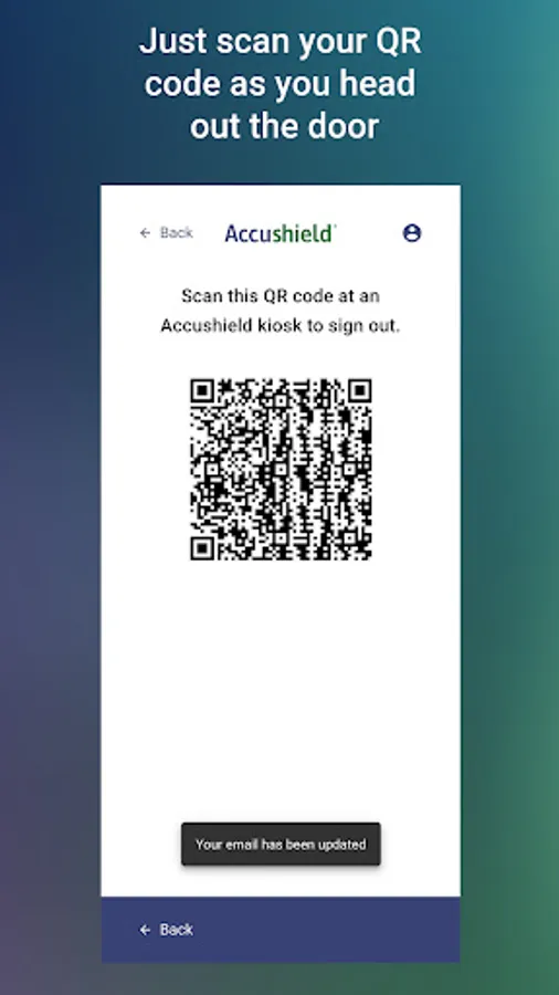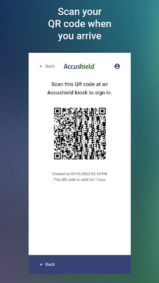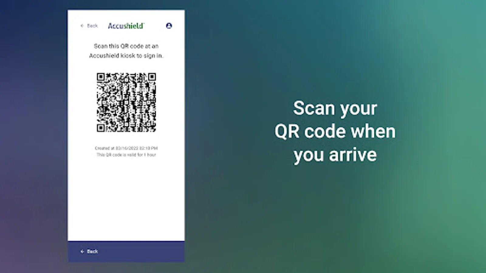 - When you arrive at the Accushield Kiosk, scan your mobile QR code to sign in, scan your temperature at the kiosk, and print a name badge all without having to touch the kiosk screen.