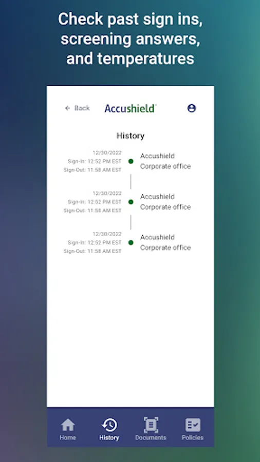 Accushield Mobile works with the Accushield Kiosk to enable a fast, touchless sign-in and screening experience at senior living communities and skilled nursing facilities. This version of the app is designed specifically for staff member, healthcare/service provider and family/guest sign in/sign out. If you need technical assistance with signup, please contact your senior living community or skilled nursing facility.