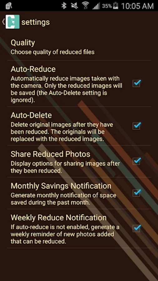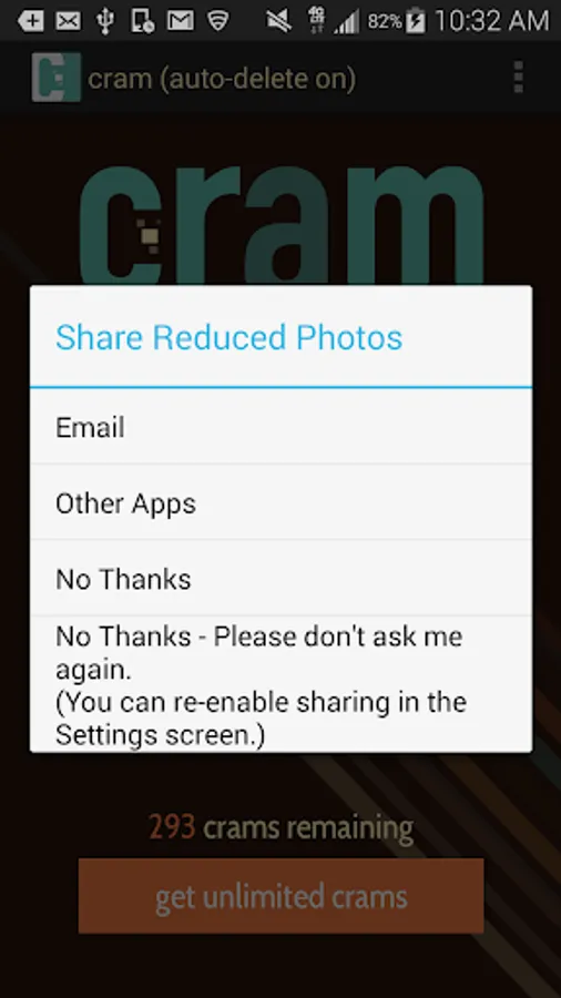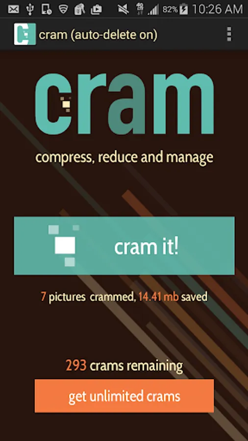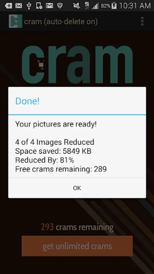 Turn on auto-reduce and realize the benefits of Cram with no effort at all. With auto-reduce enabled, pictures you take with your camera will be automatically reduced in the background. Since only the reduced pictures will be saved, you will immediately start saving space.
