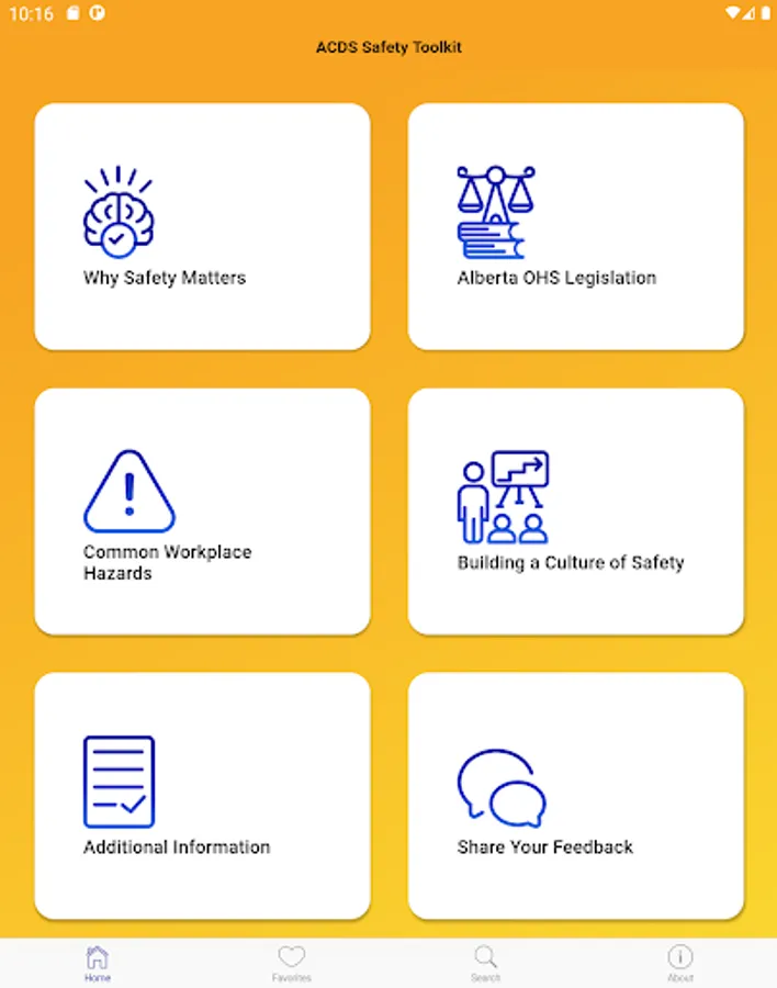 The ACDS Safety Toolkit app provides information and resources to strengthen the health and safety of staff within the Community Disability Services (CDS) sector in Alberta.