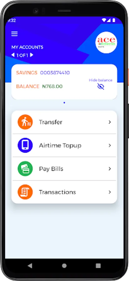 ace Mobile Banking App provides reliable and convenient access to both financial and non-financial transactions 24/7 by its clients via their mobile phones.