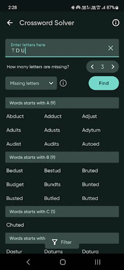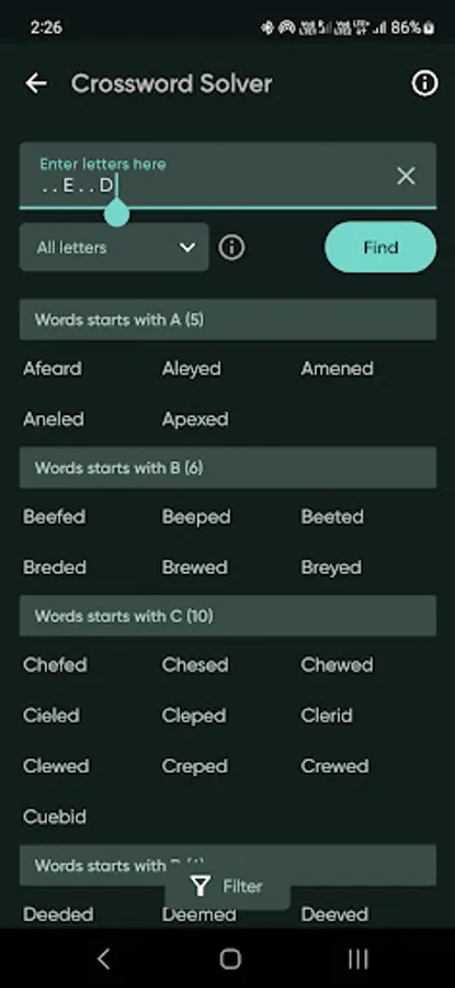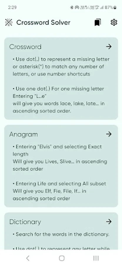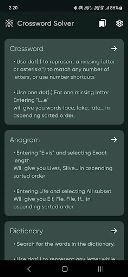 Crossword Solver is a tools for solving Crossword and anagram puzzles with Offline catalog of over 300k English words. Its really helpful If you stuck on crossword puzzle . Build the words for word games . Beat the clock with a huge set of offline database with fast search to win all of your word games!