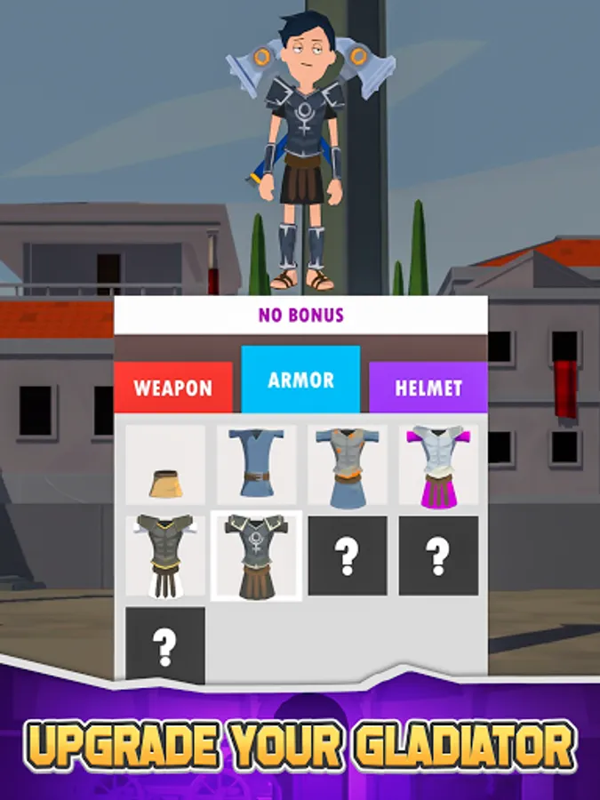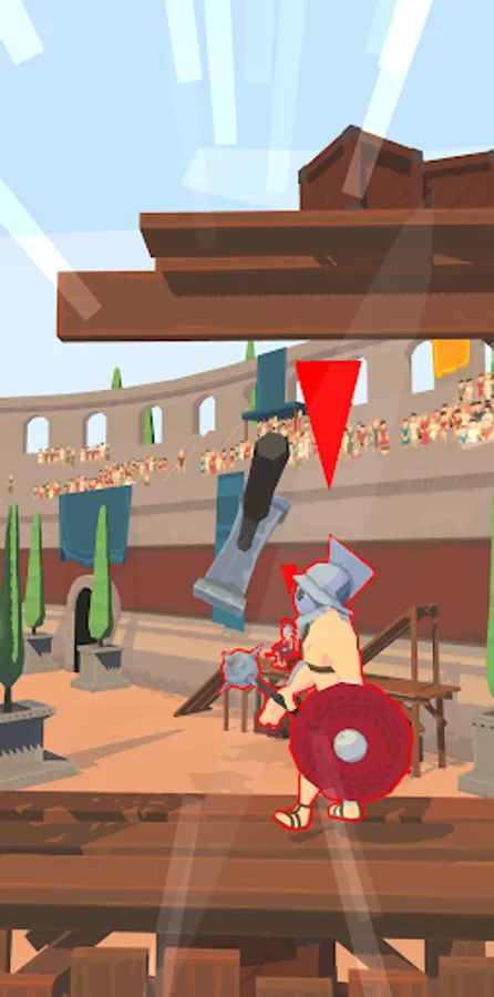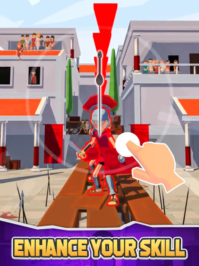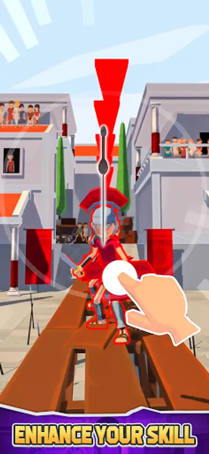You are back in a gladiatorial Roman colosseum in Rome. Excited crowds are cheering loudly for you as you walk onto the central stage of the arena. It’s a fight to the death - you want to battle for survival otherwise this is your last show. Find the best position to start. Aim your target well by moving the flying weapon towards the right direction it’s traveling. Go up, further up, right to the point. There you go! Your opponent is defeated!