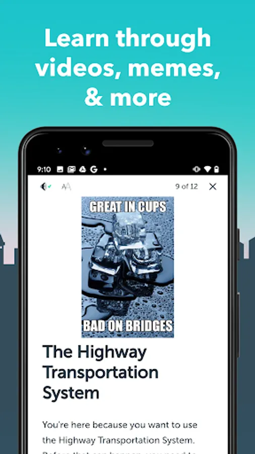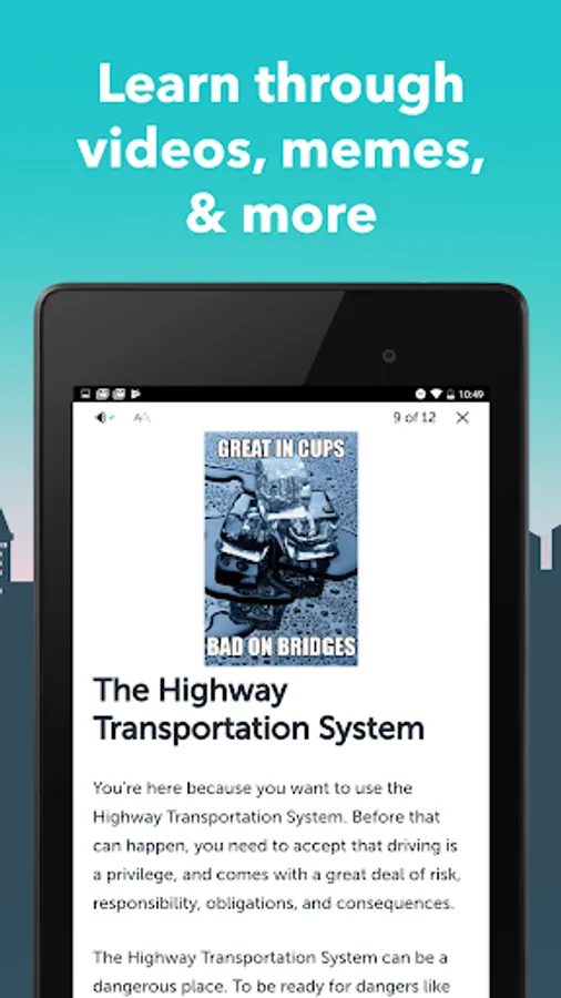 • Our driving school app uses witty writing, relevant memes and interactive videos to keep even those with shortest attention spans engaged and learning.