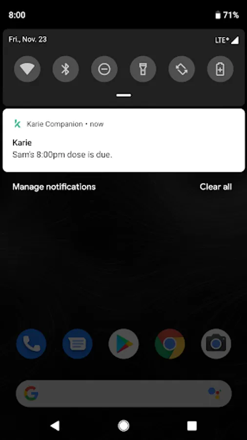 Karie Companion pairs you with the user of a Karie medication delivery device. The device may be yours or it may belong to someone you care for, such as a family member. The App notifies you when a dose of medication is due, taken early or missed altogether. You can call the Karie device user from within the App's notifications to inquire or remind them. You can also review their medication history and dose adherence for valuable information.