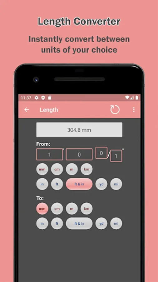 - Length: mm, cm, m, km, inch, foot, ft & in, yard, mile